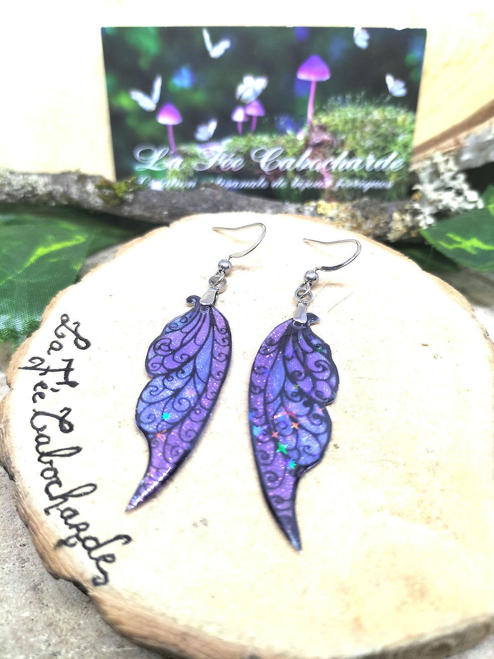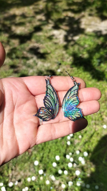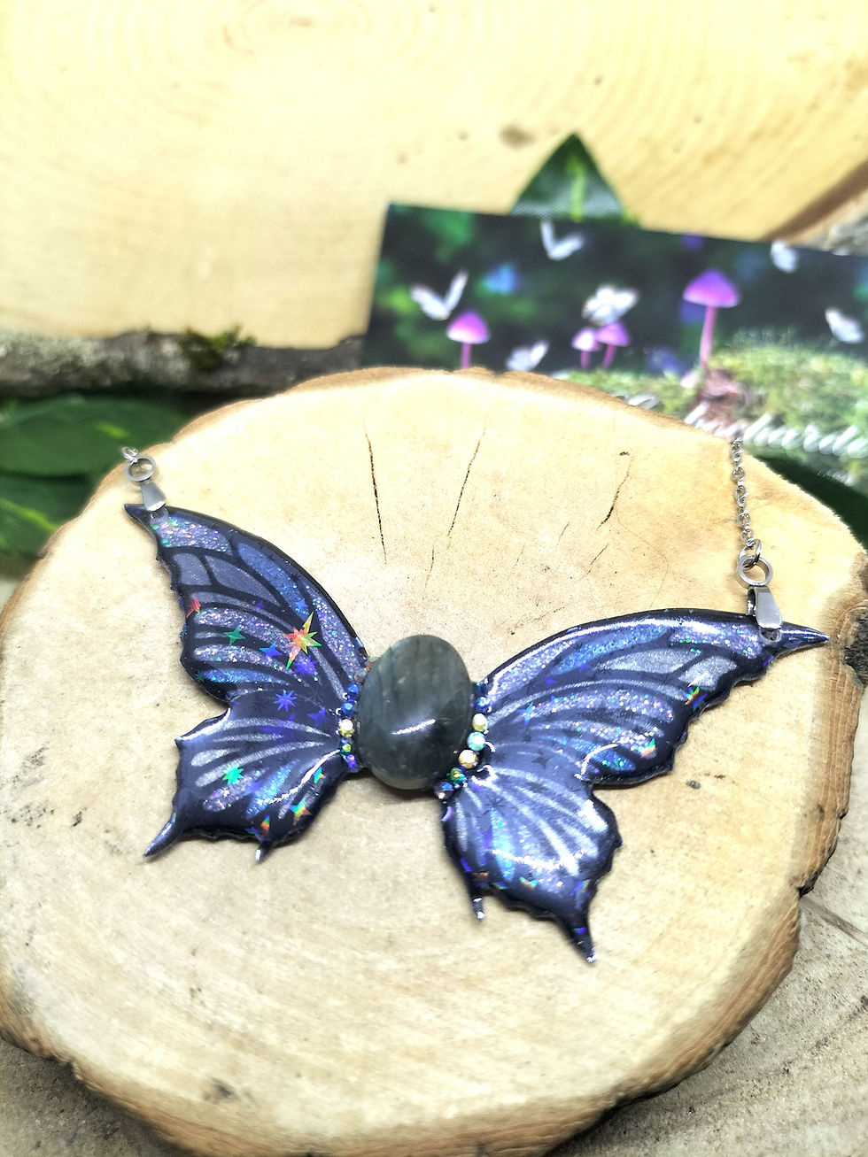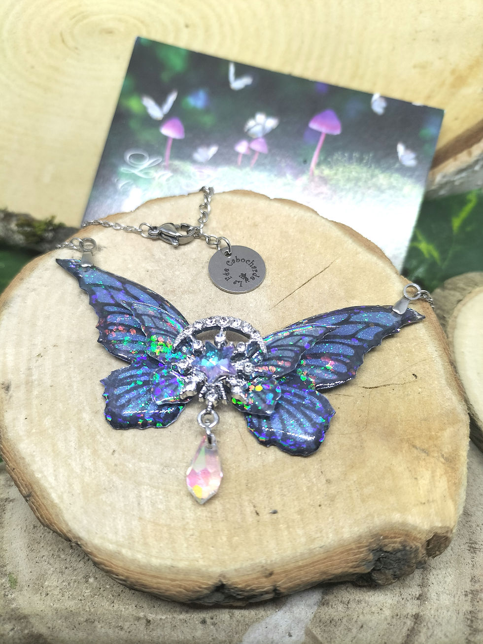 Ces colliers sont réalisés à partir d'ailes féériques aux reflets magiques cristallisées dans la résine..